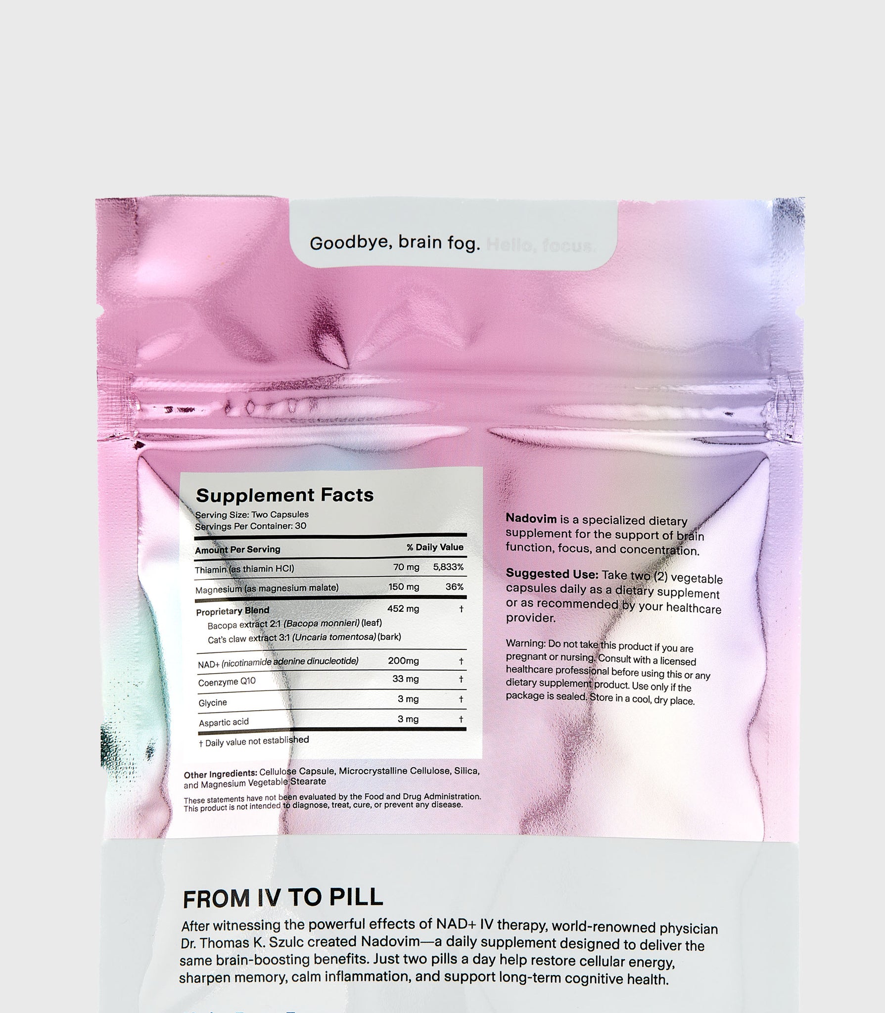 Their next challenge was translating this powerful therapy into a safe, effective oral supplement. Dr. Szulc and a skilled nutraceutical development team studied emerging research, including a 2006 Japanese study suggesting oral NAD+ could be absorbed and a 2016 double-blind trial showing the benefits of NAD+ combined with CoQ10 for chronic fatigue. After extensive formulation, testing, and refinement, they developed Nadovim. This clinical-grade brain supplement combines NAD+ with a synergistic blend of nootropics and nutrients, delivering cognitive and cellular benefits in a convenient daily capsule.